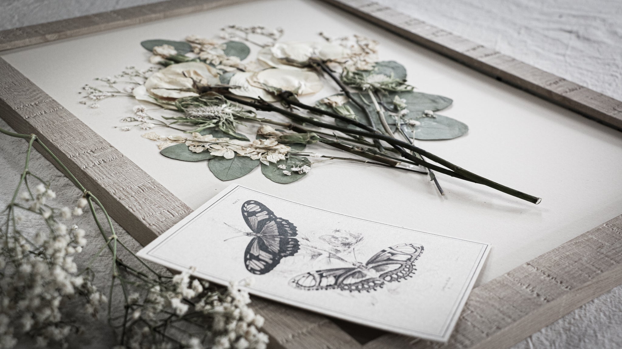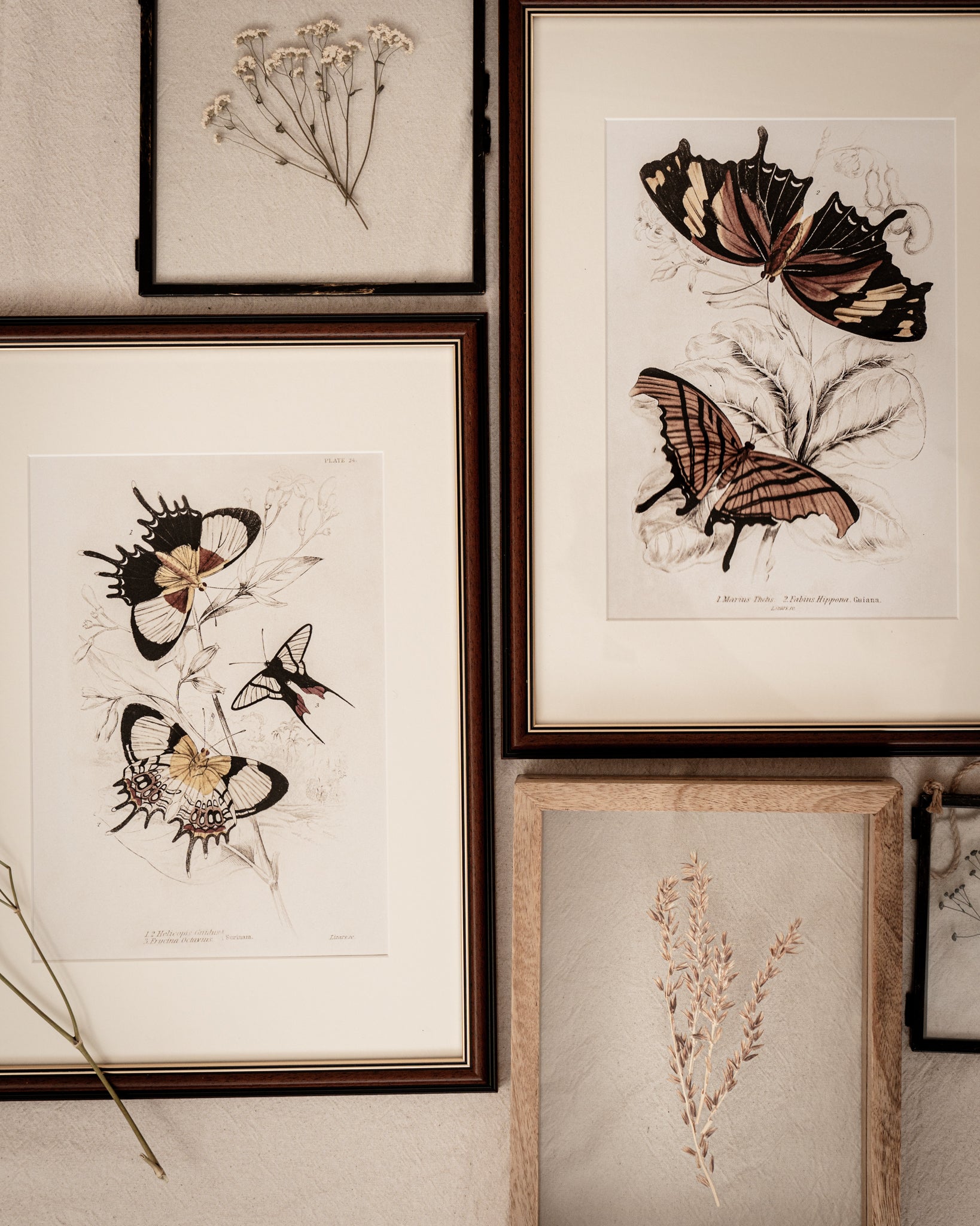 There’s a quiet magic in layering, where vintage butterfly prints meet the delicate poetry of pressed flowers, and mismatched frames create harmony through contrast. This kind of gallery wall isn't just decor; it's a slow dance of texture, tone, and time. The varied frame sizes guide the eye, while the blend of illustration and nature adds depth and soul. Each piece whispers a story, turning a simple wall into a living, breathing collage of nostalgia and natural beauty.